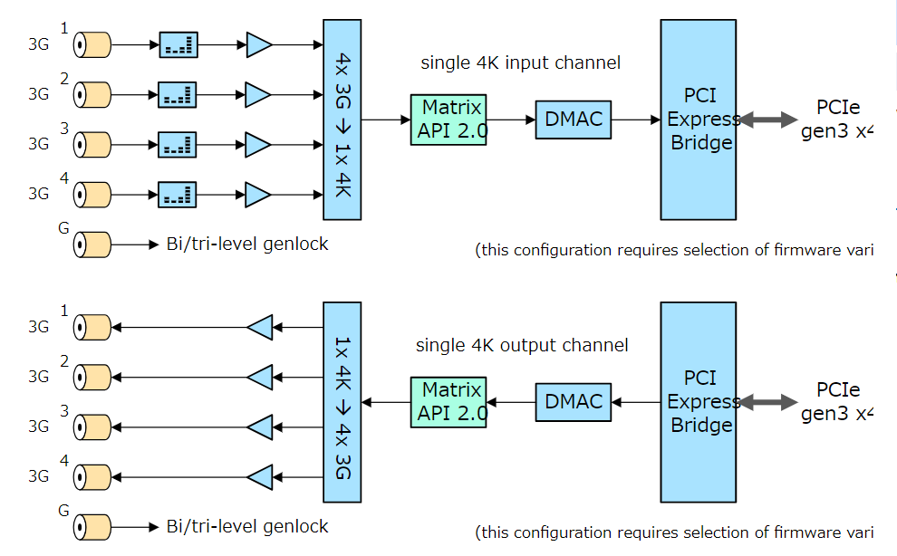 これらの構成では、単一の 4K ストリームがソフトウェアに送信またはソフトウェアから受信されます。ファームウェアは、4K 信号を SMPTE 425-5 クアッドリンク信号に変換します。