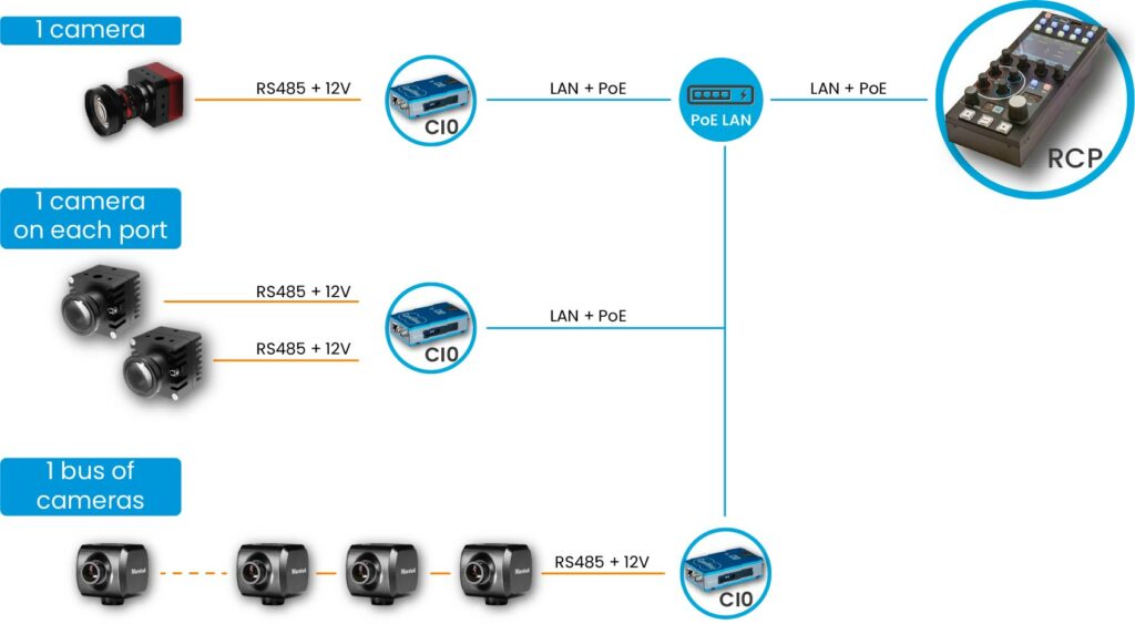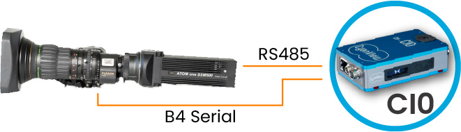 The CI0 can typically connect one camera on each although most workflows will use one camera only. For RS485 low level protocols, the CI0 will support a camera bus and allows multiple cameras to be connected to the same port, each having a different bus ID.