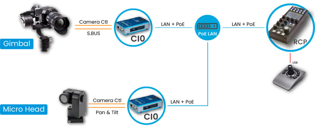 Other Pan & Tilt heads are supported such as the Micro-L from Bradley, VISCA heads such as Rushworks or Egripment Minishot/Microshot using the 3 port version of the CI0 and the multi-channel DAC active cable.