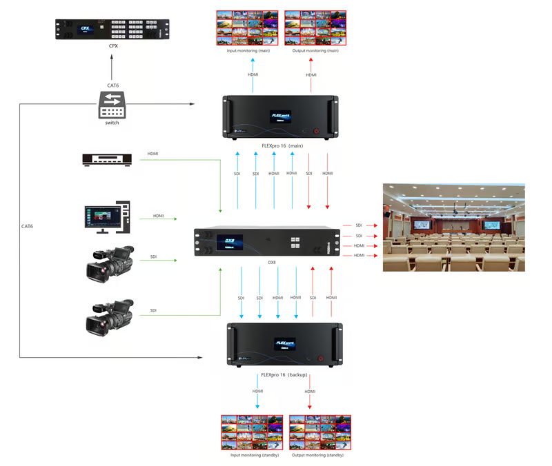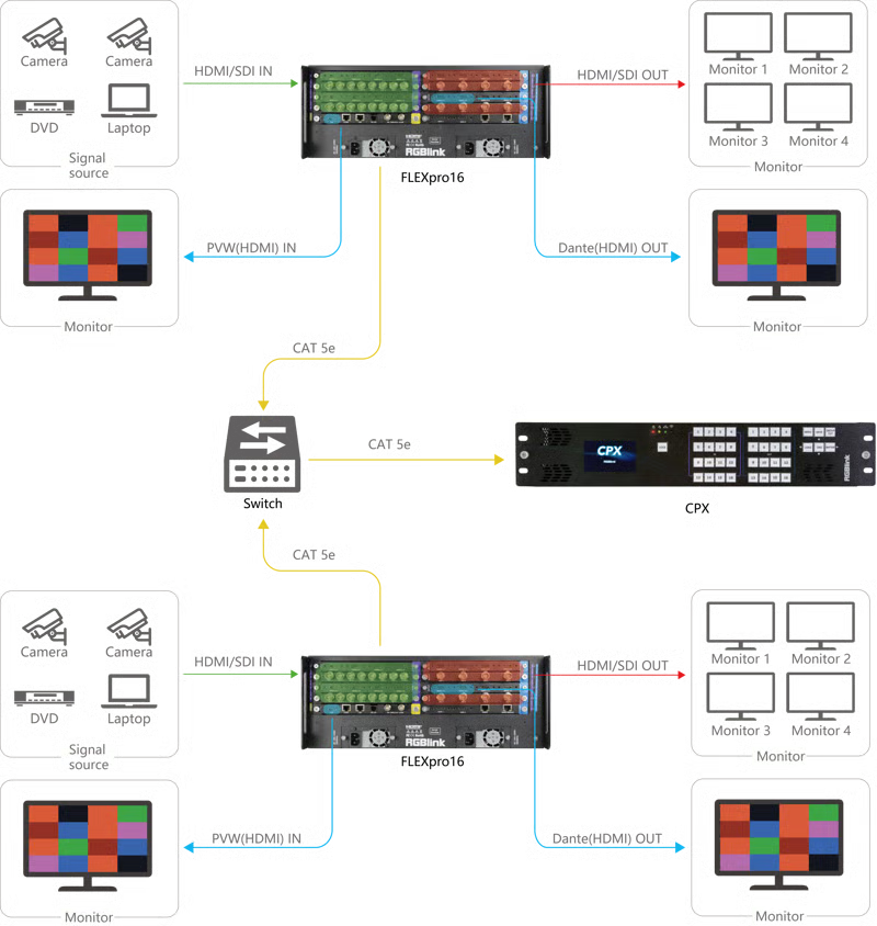 FLEXpro16 is a high-performance video image processing system with pure hardware FPGA processing architecture. The whole machine adopts modular configuration, plug-in card structure, can be flexibly configured according to user needs, input and output cards to meet the needs of a variety of video applications on site. Support input and output card hot-swapping, dual power supply hot backup, stable performance, is a set of multiple mixed-signal access, arbitrary distribution, seamless switching, multi-screen processing and other functions in one broadcast-grade multifunctional video conferencing and control all-in-one machine, can be widely used in government agencies, enterprises, public institutions, the military and other organizations of the major meetings, command and control, exhibitions and other fields.