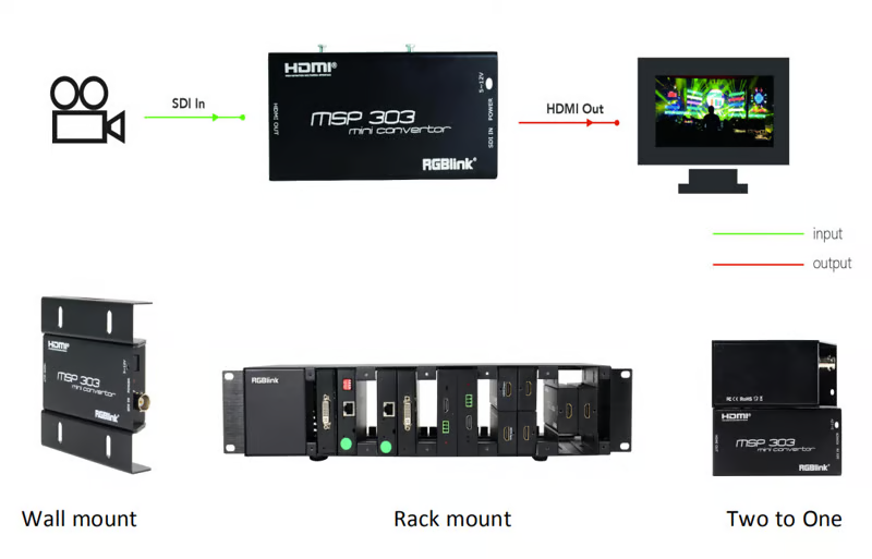 MSP 303 is a SDI to HDMI video converter, which supports 1 SDI input and 1 HDMI output. SDI input support480i@60, 576i, 720P@50/59.94/60, 1080i@50/59.94/60, 1080P@23.98/24/25/29.97/30/50/59.94/60. And HDMI output support 720× 480@60, 720×576@60, 1280×720@60, 1920×1080@23.98/24/25/29.97/30/50/59.94/60. Besides, an optional pair of mounting ears can be mounted on the MSP rack.