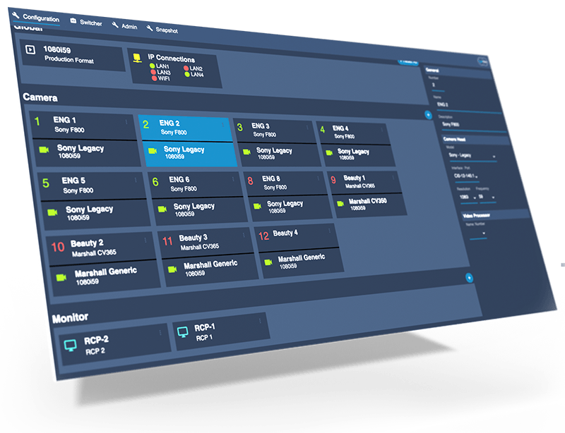 カメラのプロトコル設定やインターフェースの追加、外部レンズやパン・チルト制御、ビデオプロセッサ、IP設定なども、わずか数分で完了します。
