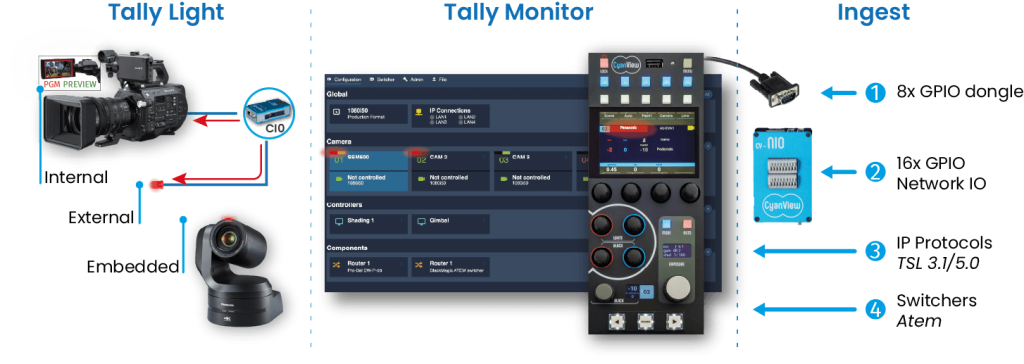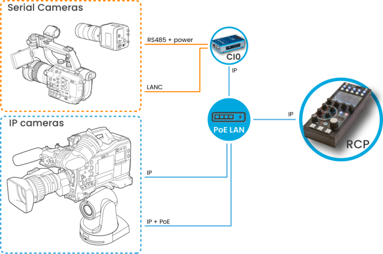 シリアル制御のカメラに対しては、CyanviewのCI0カメラインターフェースが、LANC、RS232、RS485、VISCA、SBUSなどの各種プロトコルをIP信号へ変換し、IPベースでの統合的な制御を可能にします。