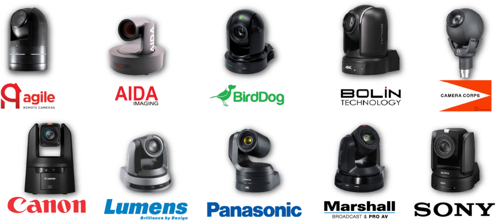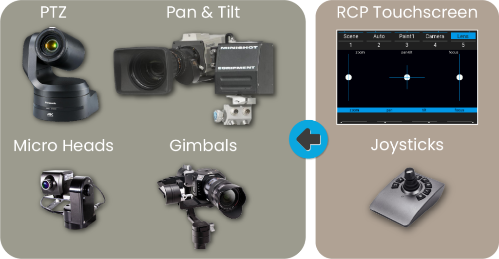 多くのPTZカメラに加え、大型パン・チルトヘッドや、S.BUS経由のジンバル、一部の**小型リモートヘッド(マイクロヘッド)**にも対応しています。